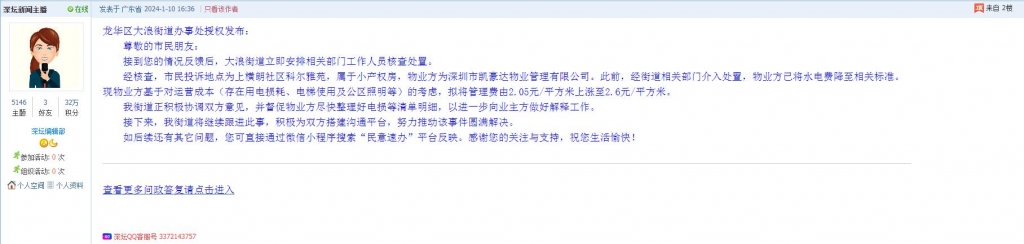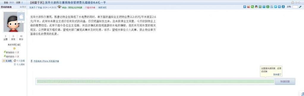 6、帖文《龙华大浪科尔雅苑物业管理费无端涨价0.6毛一平》