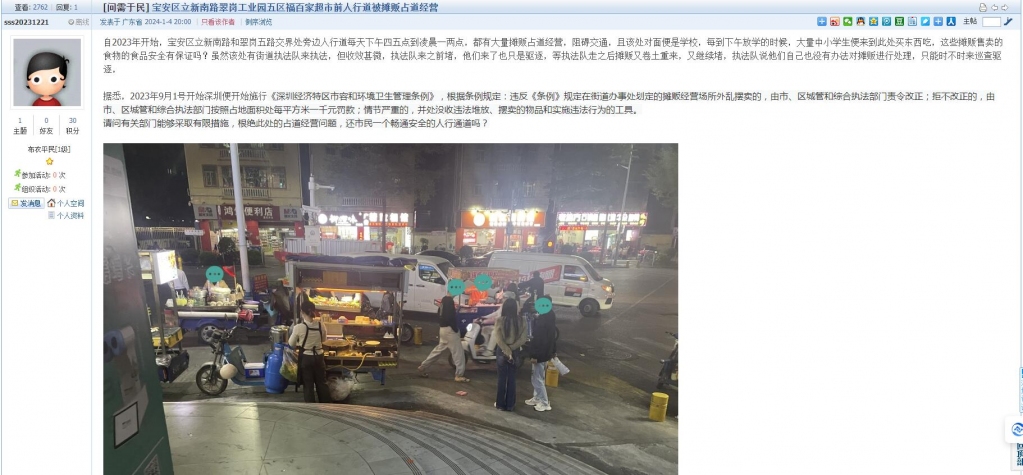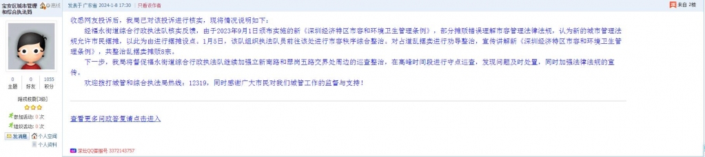 经福永街道综合行政执法队核实反馈,由于2023年9月1日颁布实施的新《深圳经济特区市容和环境卫生管理条例》,部分摊贩错误理解市容管理法律法规,认为新的城市管理法规允许市民摆摊,以此为由进行摆摊设点。1月5日,该队组织执法队员前往该处进行市容秩序综合整治。对占道乱摆卖进行劝导整治,宣传讲解新《深圳经济特区市容和环境卫生管理条例》,共整治乱摆卖摊贩8宗。