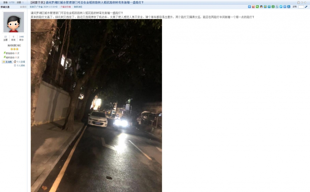 4、帖文《请问罗湖区城市管理部门可否在金稻田路转入稻花路的转弯处新增一盏路灯?》