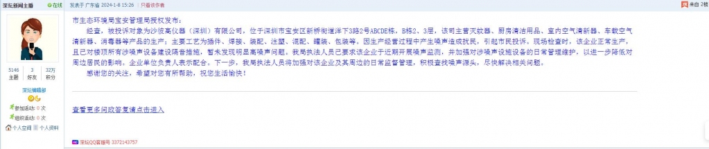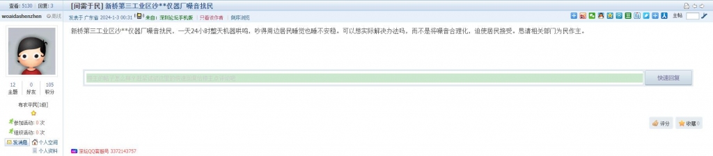 1、帖文《新桥第三工业区沙**仪器厂噪音扰民》