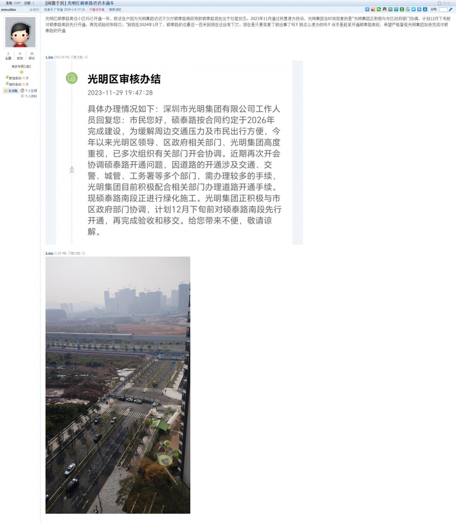 10、帖文《光明区硕泰路迟迟未通车》