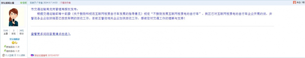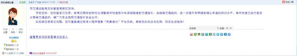 各职能单位如需对网友反映的问题进行回应,可在深圳论坛注册官方账号并通过认证,回帖进行回应。