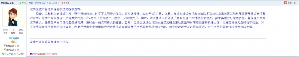 经查,三和村为老旧城中村,硬件设施较差,时有不文明养犬发生。针对该情况,2024年4月27日、28日,宝龙街道综合行政执法队多次前往龙东社区三和村周边开展养犬专项整治行动,行动中均未发现不文明养犬行为。在4月27日的行动中,捕获一只流浪犬只。同时,该队执法人员约谈了龙东社区三和村物业管理处,要求其履行好管理责任,督促住户做好文明养犬、提醒住户出门溜犬要牵好狗绳,适时做一些文明养犬的宣传。目前,宝龙街道综合行政执法已加强龙东社区三和村周边巡查和执法力度,如发现流浪犬及时收容收治,对不文明养犬违法行为将依法查处。我局已要求宝龙街道综合行政执法队定期开展不文明养犬专项执法行动,如发现流浪犬及时收容收治,对不文明的养犬违法行为依法处理。