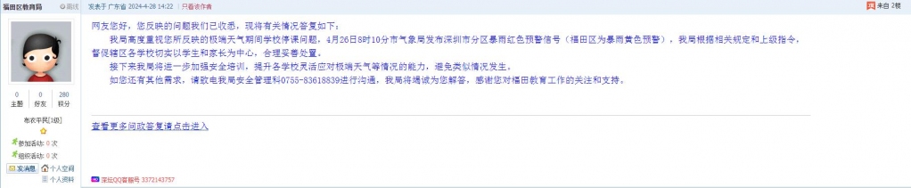 我局高度重视您所反映的极端天气期间学校停课问题,4月26日8时10分市气象局发布深圳市分区暴雨红色预警信号(福田区为暴雨黄色预警),我局根据相关规定和上级指令,督促辖区各学校切实以学生和家长为中心,合理妥善处置。
