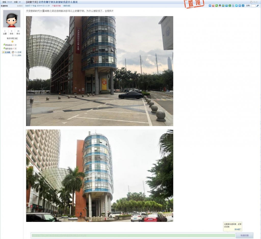 1、帖文《这些老椰子树无故被砍伐是什么情况》