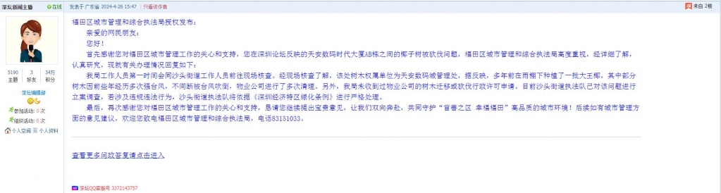 首先感谢您对福田区城市管理工作的关心和支持,您在深圳论坛反映的天安数码时代大厦AB栋之间的椰子树被砍伐问题,福田区城市管理和综合执法局高度重视,经详细了解,认真研究,现就有关办理情况回复如下: