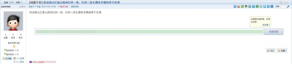 19、帖文《投诉南山区丽山路和红岭一街,红岭二街长期有车辆违停不处理》