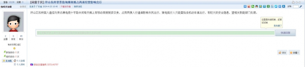 4、帖文《坪山坑梓翠景路地摊商贩占两道经营影响出行》