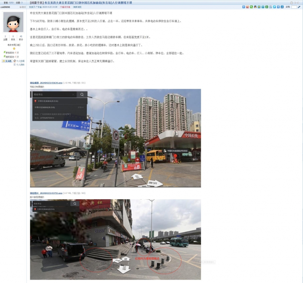 6、帖文《布吉龙岗大道吉星花园门口到中国石化加油站(布吉站)人行道拥堵不堪》
