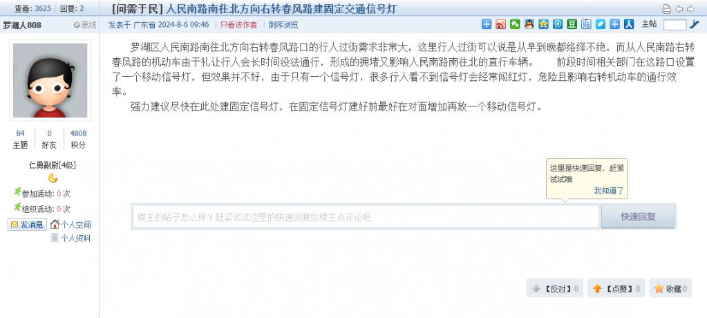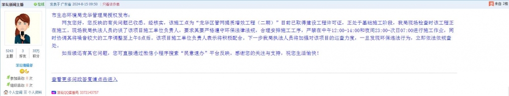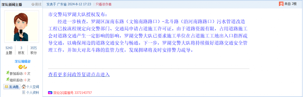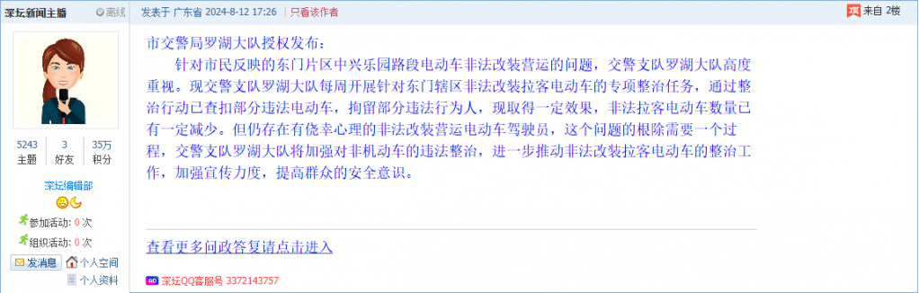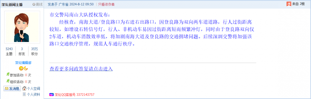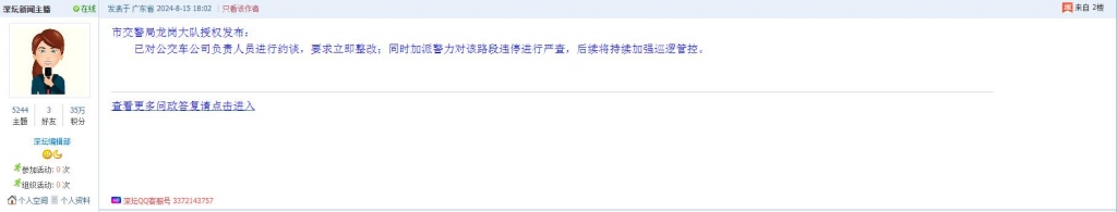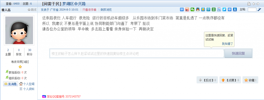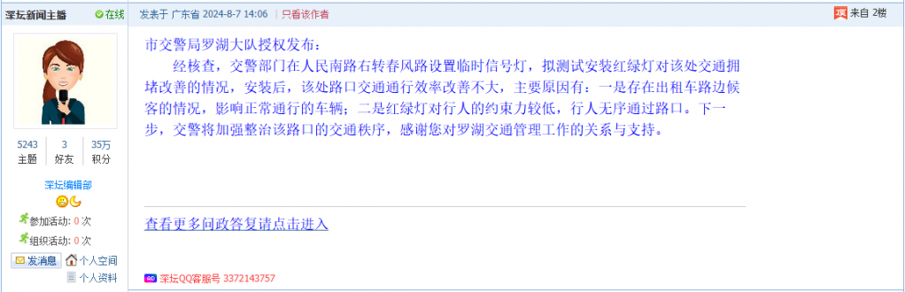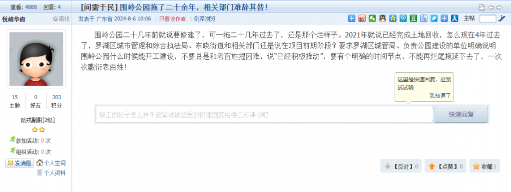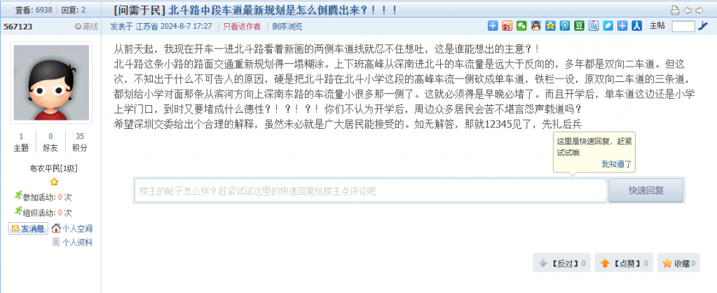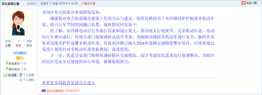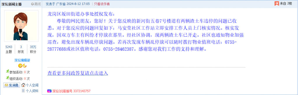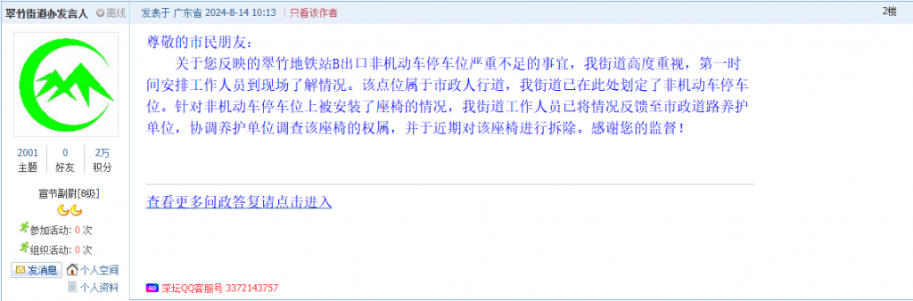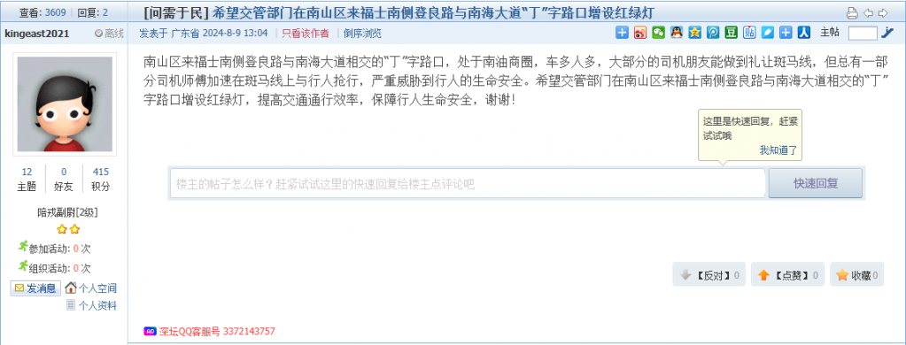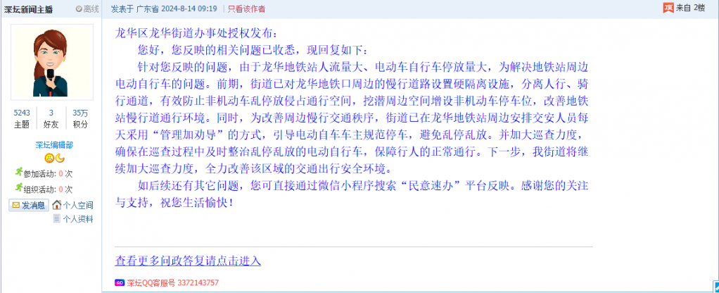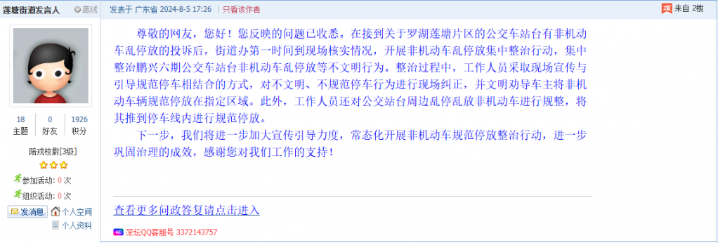 各职能单位如需对网友反映的问题进行回应,可在深圳论坛注册官方账号并通过认证,回帖进行回应。