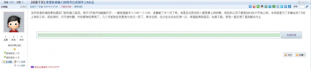 9、帖文《希望街道施工时间可以改到早上8点后》