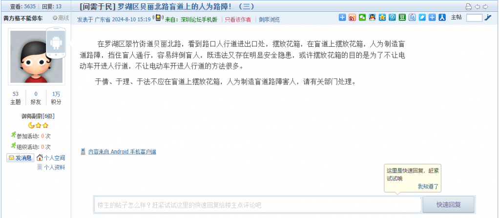 18、帖文《罗湖区贝丽北路盲道上的人为路障!(三)》