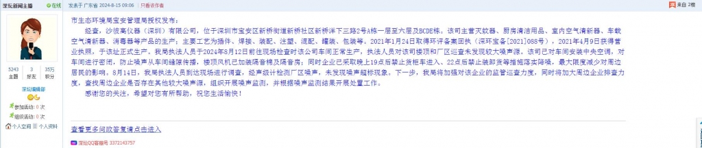 经查,沙彼高仪器(深圳)有限公司,位于深圳市宝安区新桥街道新桥社区新桥洋下三路2号A栋一层至六层及BCDE栋。该司主营灭蚊器、厨房清洁用品、室内空气清新器、车载空气清新器、消毒器等产品的生产;主要工艺为插件、焊接、装配、注塑、混配、罐装、包装等。2021年1月24日取得环评备案回执(深环宝备[2021]088号),2021年4月9日获得营业执照,于该址正式生产。我局执法人员于2024年8月12日前往现场检查时该公司车间正常生产,执法人员对该司楼顶和厂区巡查未发现较大噪声源。该司已对车间安装中央空调,对车间进行密闭,防止噪声从车间缝隙传播,楼顶风机已加装隔音棉及隔音房;同时企业已采取晚上19点后禁止货柜车进入、22点后禁止装卸货等措施落实降噪,最大限度减少对周边居民的影响。8月14日,我局执法人员到达现场进行调查,经声级计检测厂区噪声,未发现噪声超标现象。下一步,我局将加强对该企业的监管巡查力度,同时将加大周边企业排查力度,查找周边企业是否存在其他较大噪声源,组织开展噪声监测,并根据噪声监测结果开展处置工作。