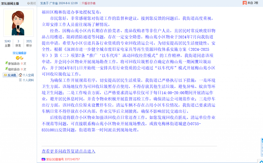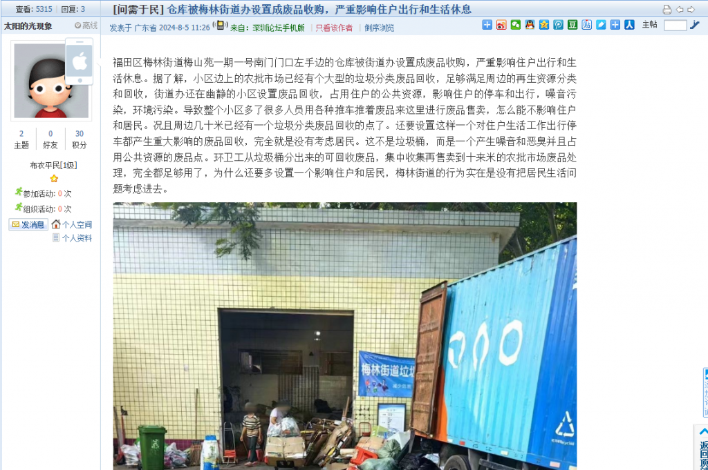 3、帖文《仓库被梅林街道办设置成废品收购,严重影响住户出行和生活休息》
