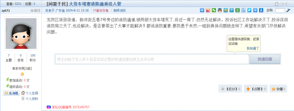 网友如有相关诉求、建言和意见的,可直接在深圳论坛“我说深圳事”栏目发帖进行报料、投诉,或者通过官方报料QQ以及问政热线等渠道反映诉求。