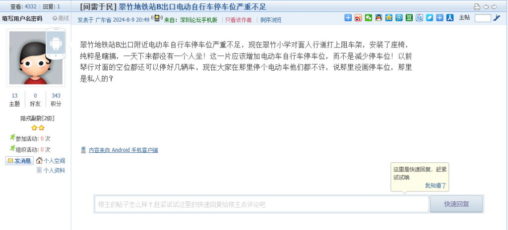 15、帖文《翠竹地铁站B出口电动自行车停车位严重不足》