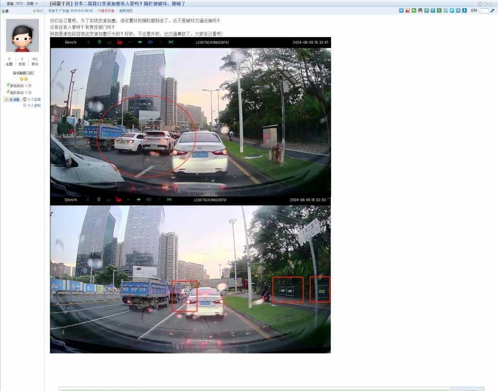 6、帖文《甘李二路路口变道加塞有人管吗?隔栏被破坏,擦碰了》