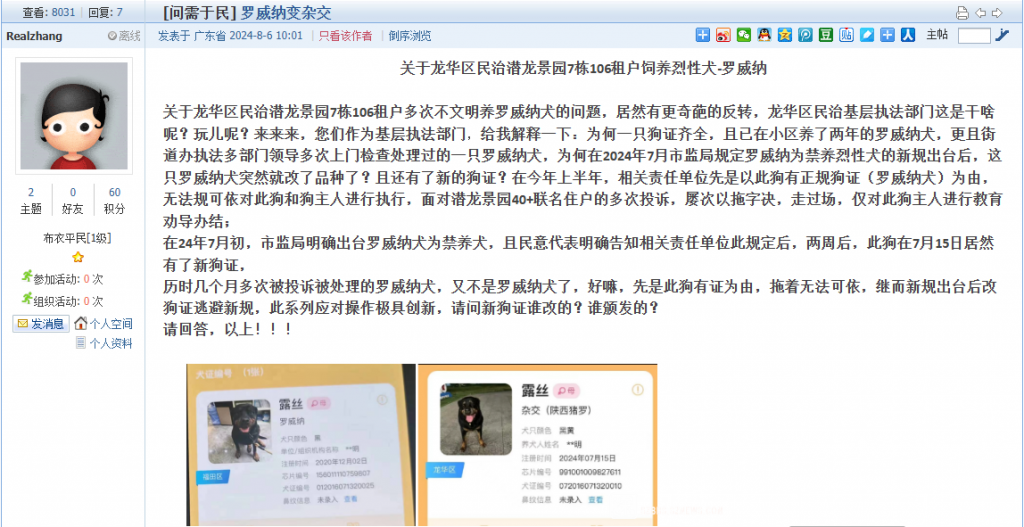 您好,您反映的相关问题已收悉,现回复如下: 8月2日,民治街道协同相关工作人员前往租户现场核实情况。经现场了解,涉事犬只主人已将犬只送往外地寄养。工作人员现场向该租户宣讲普及《深圳市养犬管理条例》等相关规定和行政处罚措施;明确告知租户根据《深圳市市场监督管理局关于公布烈性犬名单的通告》最新内容,深圳市新增的38个烈性犬品种,其中包含罗威纳犬,均属于禁止饲养的范畴。后续,街道相关职能部门和社区工作站将持续加强巡查和管理,联合市监所进一步跟进核实反馈相关情况。若发现仍存在不文明养犬行为,您可拨打0755-81718453向我街道反映情况,我们将积极配合处置。