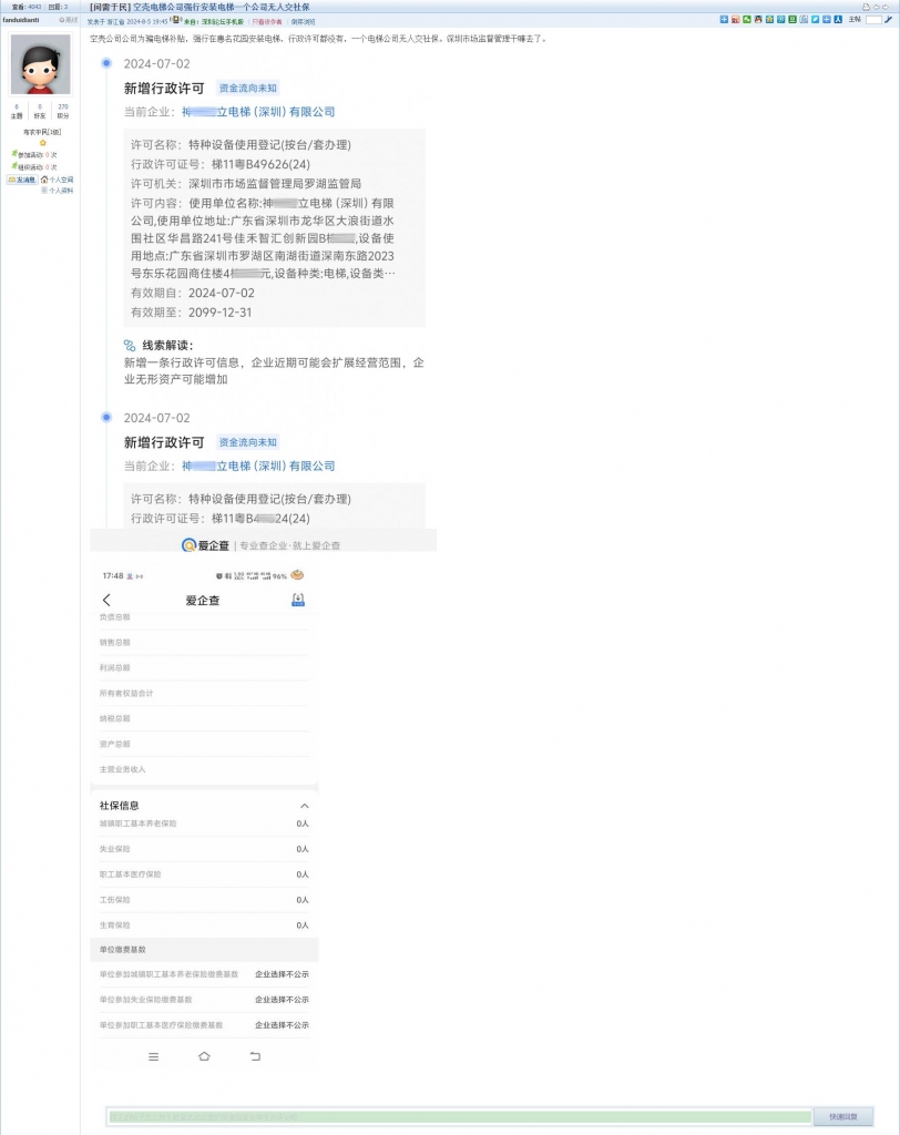 5、帖文《空壳电梯公司强行安装电梯一个公司无人交社保》