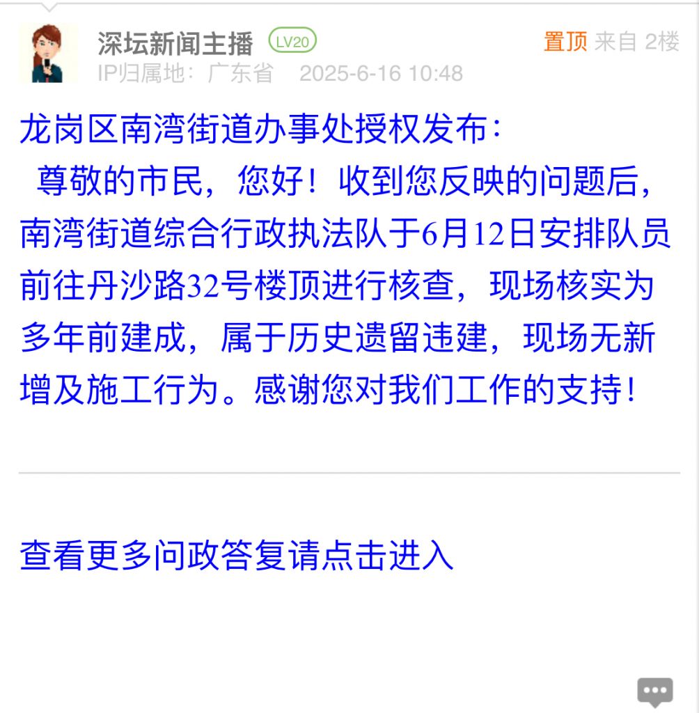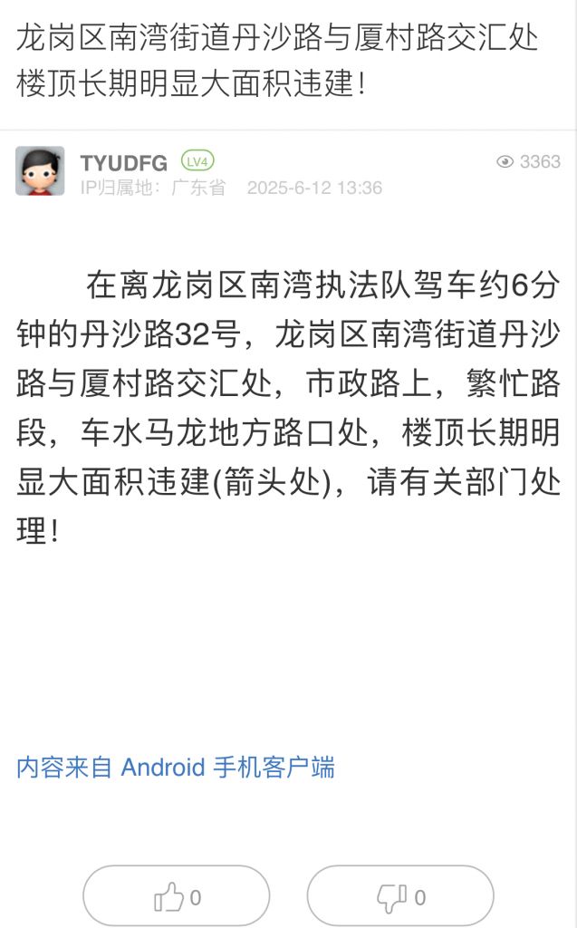 12. 帖文《龙岗区南湾街道丹沙路与厦村路交汇处楼顶长期明显大面积违建!》