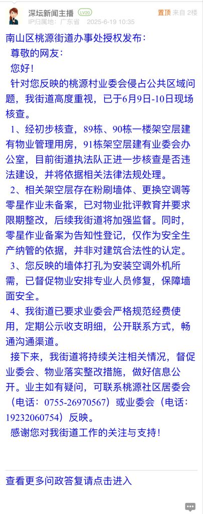 接下来,我街道将持续关注相关情况,督促业委会、物业落实整改措施,做好信息公开。业主如有疑问,可联系桃源社区居委会(电话:0755-26970567)或业委会(电话:19232060754)反映。