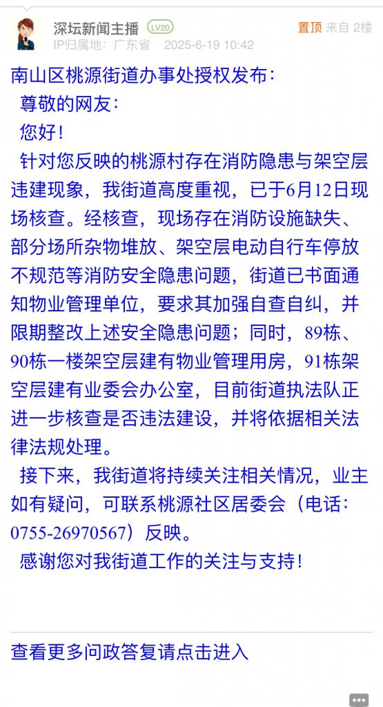 针对您反映的桃源村存在消防隐患与架空层违建现象,我街道高度重视,已于6月12日现场核查。经核查,现场存在消防设施缺失、部分场所杂物堆放、架空层电动自行车停放不规范等消防安全隐患问题,街道已书面通知物业管理单位,要求其加强自查自纠,并限期整改上述安全隐患问题;同时,89栋、90栋一楼架空层建有物业管理用房,91栋架空层建有业委会办公室,目前街道执法队正进一步核查是否违法建设,并将依据相关法律法规处理。