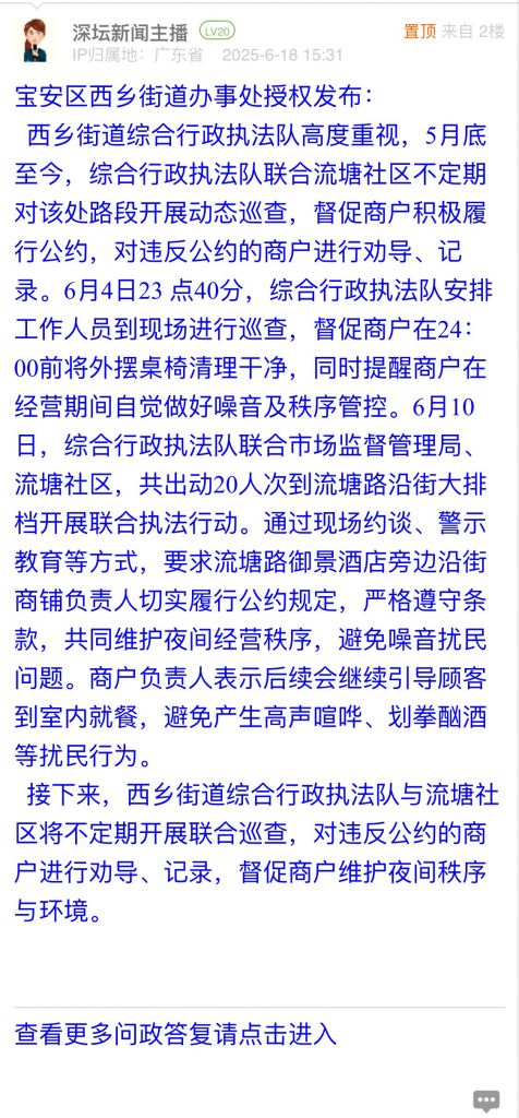 西乡街道综合行政执法队高度重视,5月底至今,综合行政执法队联合流塘社区不定期对该处路段开展动态巡查,督促商户积极履行公约,对违反公约的商户进行劝导、记录。6月4日23 点40分,综合行政执法队安排工作人员到现场进行巡查,督促商户在24:00前将外摆桌椅清理干净,同时提醒商户在经营期间自觉做好噪音及秩序管控。6月10日,综合行政执法队联合市场监督管理局、流塘社区,共出动20人次到流塘路沿街大排档开展联合执法行动。通过现场约谈、警示教育等方式,要求流塘路御景酒店旁边沿街商铺负责人切实履行公约规定,严格遵守条款,共同维护夜间经营秩序,避免噪音扰民问题。商户负责人表示后续会继续引导顾客到室内就餐,避免产生高声喧哗、划拳酗酒等扰民行为。