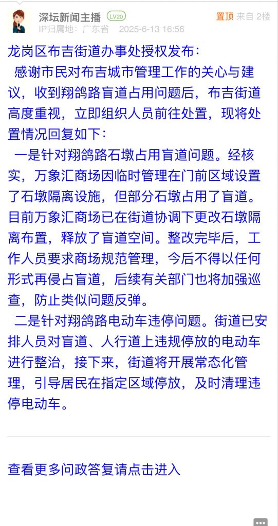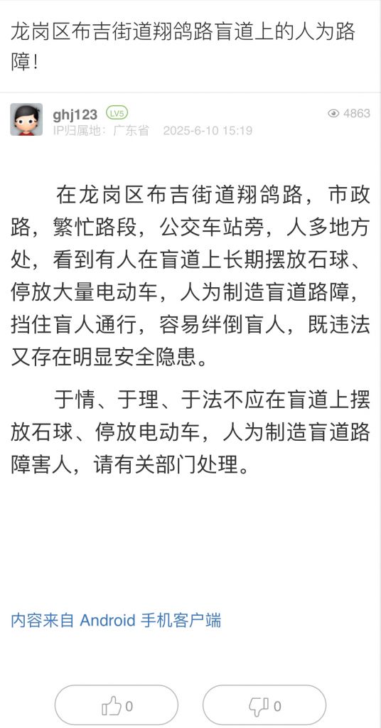 7. 帖文《龙岗区布吉街道翔鸽路盲道上的人为路障!》
