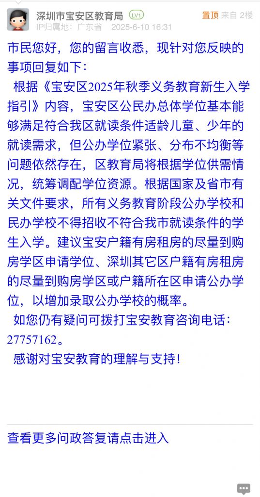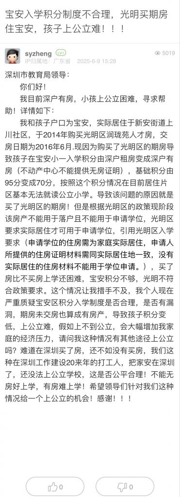 2. 帖文《宝安入学积分制度不合理,光明买期房住宝安,孩子上公立难!!!》