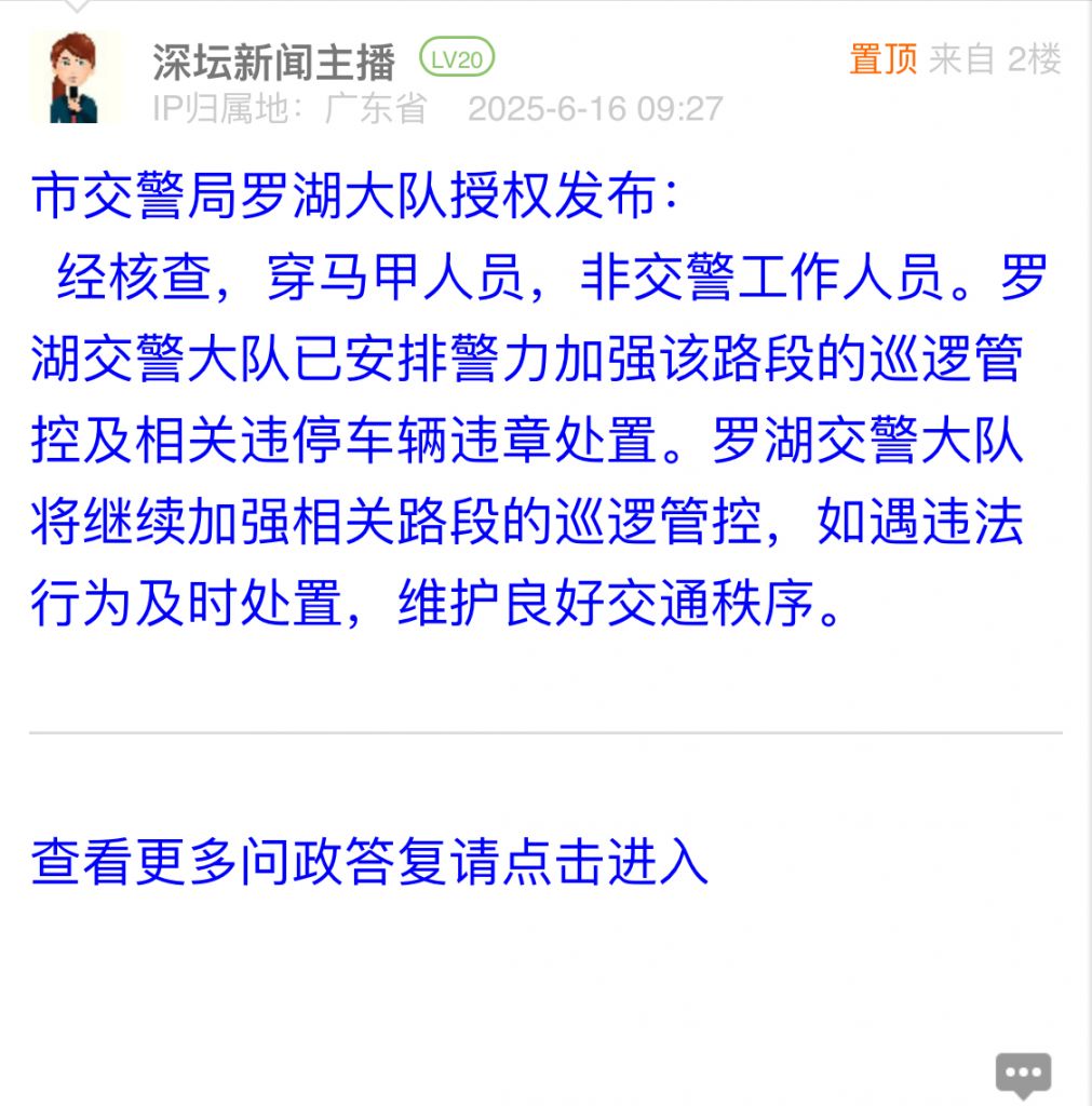 经核查,穿马甲人员,非交警工作人员。罗湖交警大队已安排警力加强该路段的巡逻管控及相关违停车辆违章处置。罗湖交警大队将继续加强相关路段的巡逻管控,如遇违法行为及时处置,维护良好交通秩序。