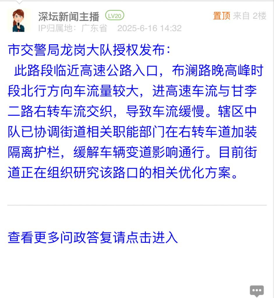 此路段临近高速公路入口,布澜路晚高峰时段北行方向车流量较大,进高速车流与甘李二路右转车流交织,导致车流缓慢。辖区中队已协调街道相关职能部门在右转车道加装隔离护栏,缓解车辆变道影响通行。目前街道正在组织研究该路口的相关优化方案。