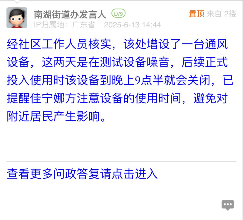经社区工作人员核实,该处增设了一台通风设备,这两天是在测试设备噪音,后续正式投入使用时该设备到晚上9点半就会关闭,已提醒佳宁娜方注意设备的使用时间,避免对附近居民产生影响。