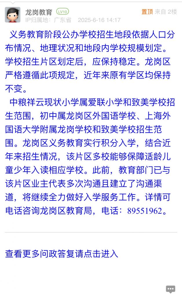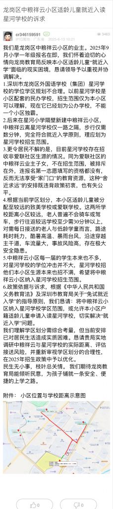 16. 帖文《龙岗区中粮祥云小区适龄儿童就近入读星河学校的诉求》