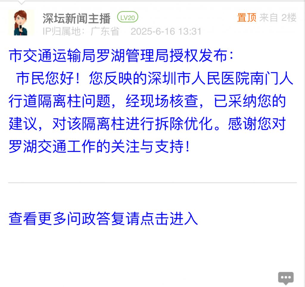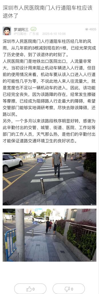 5. 帖文《深圳市人民医院南门人行道阻车柱应该退休了》