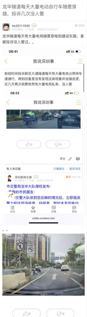 14. 帖文《龙华隧道每天大量电动自行车随意穿插,投诉几次没人管》