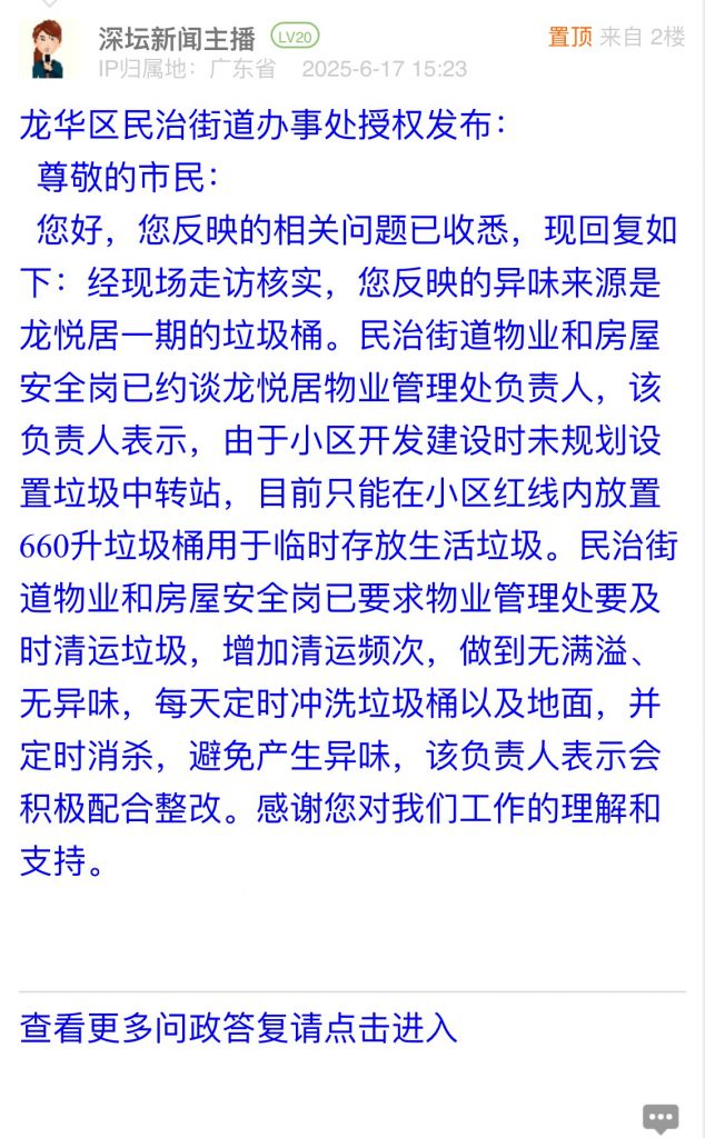 您好,您反映的相关问题已收悉,现回复如下:经现场走访核实,您反映的异味来源是龙悦居一期的垃圾桶。民治街道物业和房屋安全岗已约谈龙悦居物业管理处负责人,该负责人表示,由于小区开发建设时未规划设置垃圾中转站,目前只能在小区红线内放置660升垃圾桶用于临时存放生活垃圾。民治街道物业和房屋安全岗已要求物业管理处要及时清运垃圾,增加清运频次,做到无满溢、无异味,每天定时冲洗垃圾桶以及地面,并定时消杀,避免产生异味,该负责人表示会积极配合整改。感谢您对我们工作的理解和支持。