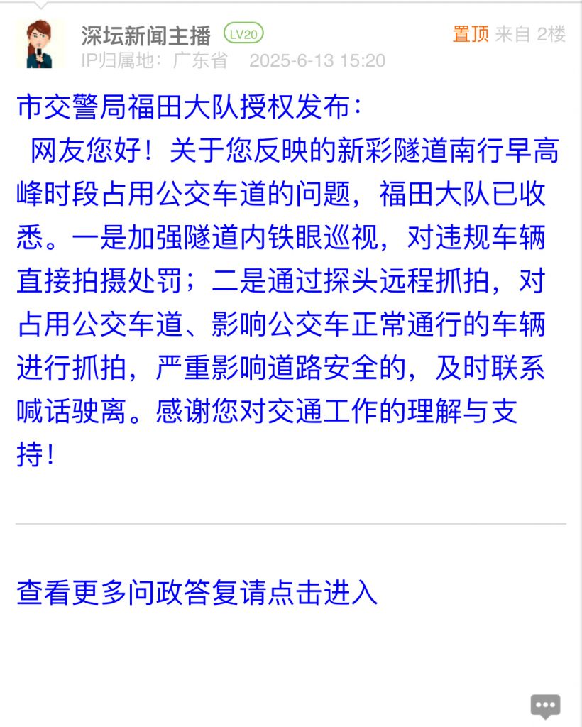 网友您好!关于您反映的新彩隧道南行早高峰时段占用公交车道的问题,福田大队已收悉。一是加强隧道内铁眼巡视,对违规车辆直接拍摄处罚;二是通过探头远程抓拍,对占用公交车道、影响公交车正常通行的车辆进行抓拍,严重影响道路安全的,及时联系喊话驶离。感谢您对交通工作的理解与支持!