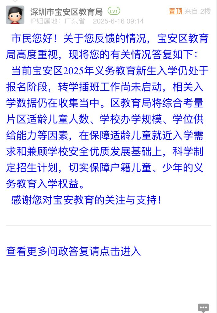当前宝安区2025年义务教育新生入学仍处于报名阶段,转学插班工作尚未启动,相关入学数据仍在收集当中。区教育局将综合考量片区适龄儿童人数、学校办学规模、学位供给能力等因素,在保障适龄儿童就近入学需求和兼顾学校安全优质发展基础上,科学制定招生计划,切实保障户籍儿童、少年的义务教育入学权益。