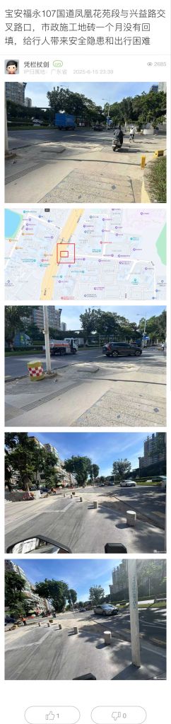 19. 帖文《宝安福永107国道凤凰花苑段与兴益路交叉路口,市政施工地砖一个月没有回填,给行人带来安全隐患和出行困难》