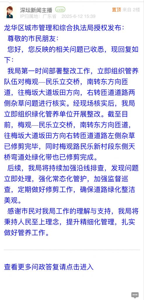 6. 帖文《关于龙华区民治街道办(梅观~民乐)立交路段绿化管养问题的诉求与建议》