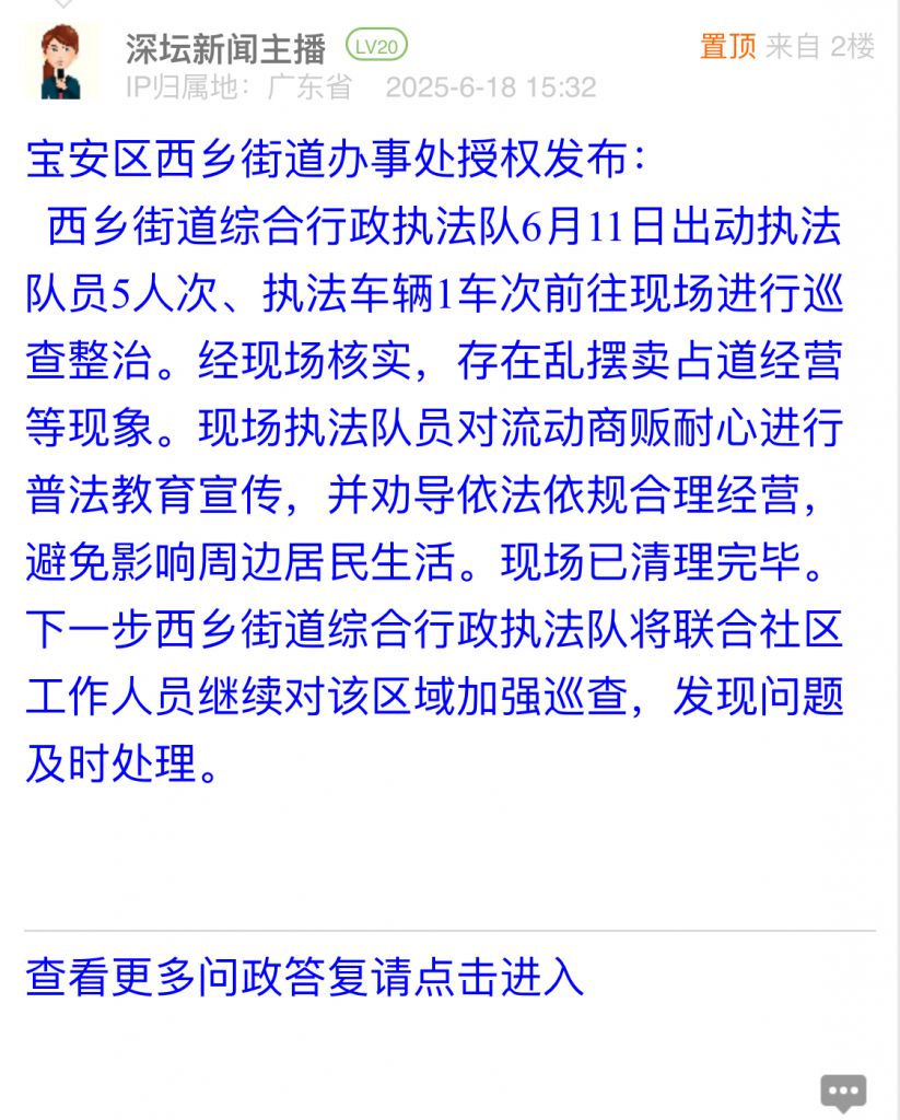 西乡街道综合行政执法队6月11日出动执法队员5人次、执法车辆1车次前往现场进行巡查整治。经现场核实,存在乱摆卖占道经营等现象。现场执法队员对流动商贩耐心进行普法教育宣传,并劝导依法依规合理经营,避免影响周边居民生活。现场已清理完毕。下一步西乡街道综合行政执法队将联合社区工作人员继续对该区域加强巡查,发现问题及时处理。