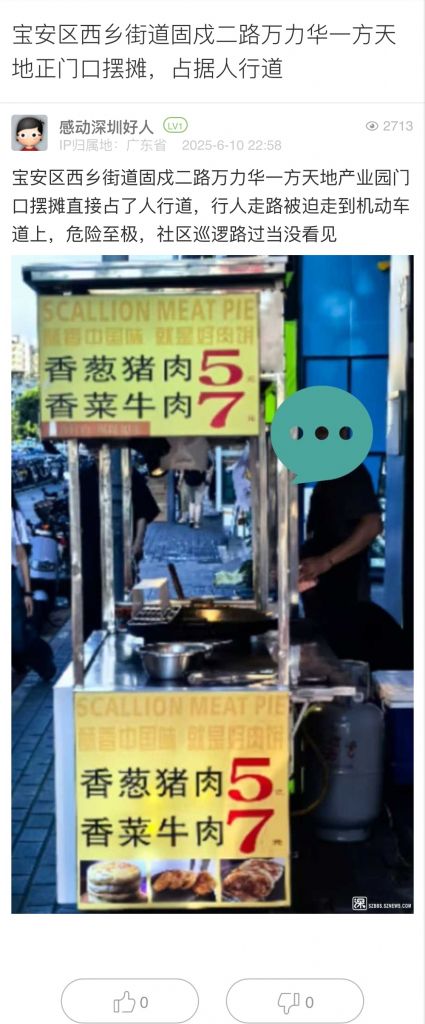 9. 帖文《宝安区西乡街道固戍二路万力华一方天地正门口摆摊,占据人行道》