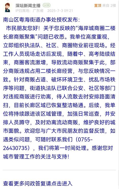 市民朋友您好!关于您反映的“海岸城商圈二楼长廊商贩聚集”问题已收悉。我单位高度重视,立即组织执法队、社区、商圈物业前往现场。经工作人员现场走访后发现,随着中、高考陆续结束,商圈客流激增,导致流动商贩聚集于此,部分商贩违规占用二楼长廊经营,与您反映情况一致。针对商贩占道、破坏环境卫生、扰乱市场秩序等问题,街道执法队已联合公安、社区等部门对违规商贩进行劝离,待人流散去时安排路面清扫,目前长廊区域已恢复整洁畅通。后续,我单位将持续跟进该区域管理,加强日常巡查,并安排人员蹲守,及时劝离流动商贩,维护良好的城市面貌。欢迎您与广大市民朋友的监督反馈,如遇类似问题,可随时联系我们(0755-26430735),我们将第一时间处理。感谢您对城市管理工作的关注与支持!