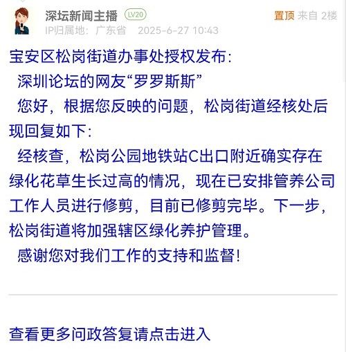 经核查,松岗公园地铁站C出口附近确实存在绿化花草生长过高的情况,现在已安排管养公司工作人员进行修剪,目前已修剪完毕。下一步,松岗街道将加强辖区绿化养护管理。