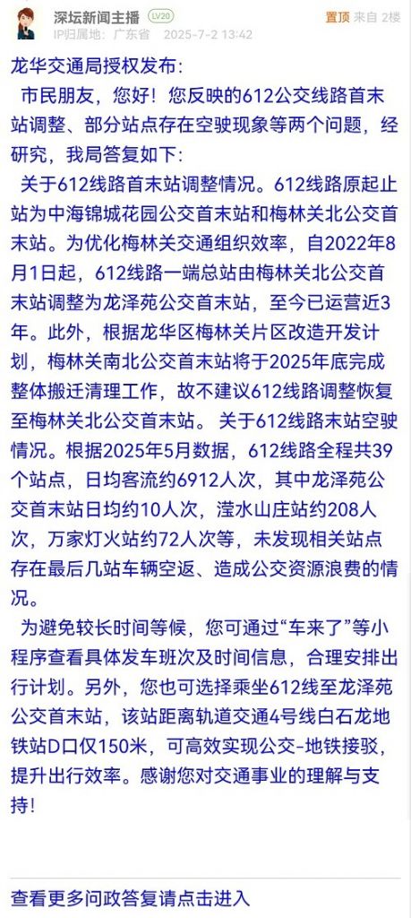 关于612线路首末站调整情况。612线路原起止站为中海锦城花园公交首末站和梅林关北公交首末站。为优化梅林关交通组织效率,自2022年8月1日起,612线路一端总站由梅林关北公交首末站调整为龙泽苑公交首末站,至今已运营近3年。此外,根据龙华区梅林关片区改造开发计划,梅林关南北公交首末站将于2025年底完成整体搬迁清理工作,故不建议612线路调整恢复至梅林关北公交首末站。 关于612线路末站空驶情况。根据2025年5月数据,612线路全程共39个站点,日均客流约6912人次,其中龙泽苑公交首末站日均约10人次,滢水山庄站约208人次,万家灯火站约72人次等,未发现相关站点存在最后几站车辆空返、造成公交资源浪费的情况。