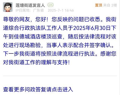 尊敬的网友,您好!您反映的问题已收悉。我街道综合行政执法队工作人员于2025年6月30日下午到佳德城酒店楼顶巡查,随后按法律流程对该处进行现场勘验,当事人表示配合并签字确认。下一步我街道将按照法律流程进行执法。感谢您对我街道工作的理解与支持!
