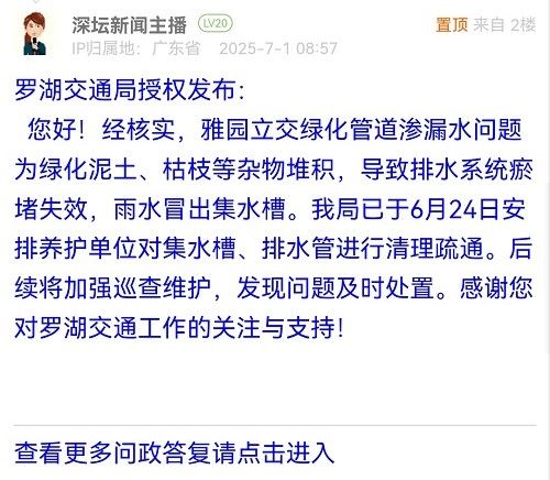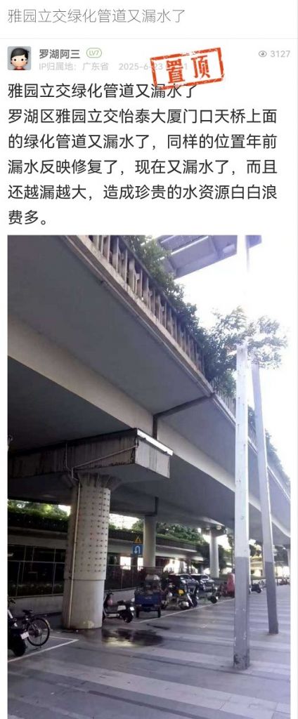 您好!经核实,雅园立交绿化管道渗漏水问题为绿化泥土、枯枝等杂物堆积,导致排水系统瘀堵失效,雨水冒出集水槽。我局已于6月24日安排养护单位对集水槽、排水管进行清理疏通。后续将加强巡查维护,发现问题及时处置。感谢您对罗湖交通工作的关注与支持!