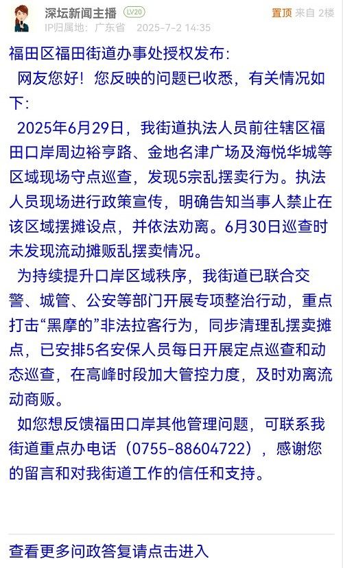 如您想反馈福田口岸其他管理问题,可联系我街道重点办电话(0755-88604722),感谢您的留言和对我街道工作的信任和支持。
