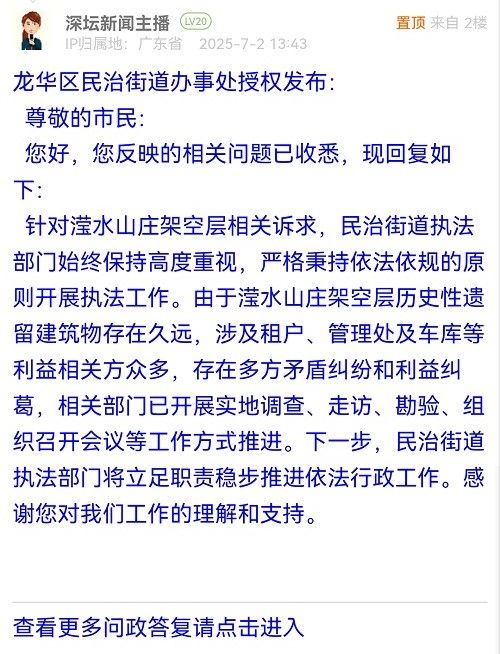 针对滢水山庄架空层相关诉求,民治街道执法部门始终保持高度重视,严格秉持依法依规的原则开展执法工作。由于滢水山庄架空层历史性遗留建筑物存在久远,涉及租户、管理处及车库等利益相关方众多,存在多方矛盾纠纷和利益纠葛,相关部门已开展实地调查、走访、勘验、组织召开会议等工作方式推进。下一步,民治街道执法部门将立足职责稳步推进依法行政工作。感谢您对我们工作的理解和支持。