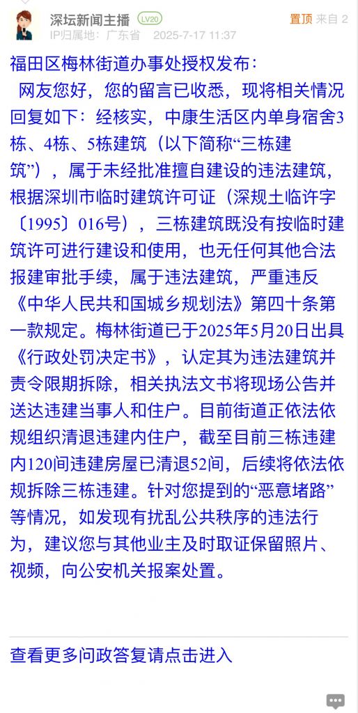 网友您好,您的留言已收悉,现将相关情况回复如下:经核实,中康生活区内单身宿舍3栋、4栋、5栋建筑(以下简称“三栋建筑”),属于未经批准擅自建设的违法建筑,根据深圳市临时建筑许可证(深规土临许字〔1995〕016号),三栋建筑既没有按临时建筑许可进行建设和使用,也无任何其他合法报建审批手续,属于违法建筑,严重违反《中华人民共和国城乡规划法》第四十条第一款规定。梅林街道已于2025年5月20日出具《行政处罚决定书》,认定其为违法建筑并责令限期拆除,相关执法文书将现场公告并送达违建当事人和住户。目前街道正依法依规组织清退违建内住户,截至目前三栋违建内120间违建房屋已清退52间,后续将依法依规拆除三栋违建。针对您提到的“恶意堵路”等情况,如发现有扰乱公共秩序的违法行为,建议您与其他业主及时取证保留照片、视频,向公安机关报案处置。